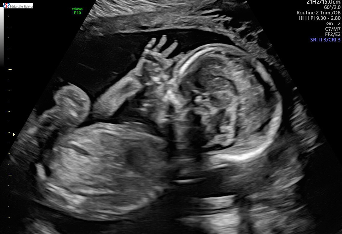 Barnmorskan går igenom alla bebisens kroppsdelar och berättar tydligt vad som visas på skärmen. Allt ser fint ut men hon vill gå tillbaka till hjärtat och tystnar och kollar koncentrerat på skärmen. Hon förtydligar (för att lugna oss) att hennes tystnad inte behöver oroa oss. Hon hämtar förstärkning av en annan sköterska och läkare för att ytterligare kolla på hjärtat. Vi kollar på läkaren och på varandra och oron ökar medan vi undrar vad det är som sker.